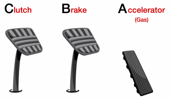 The easy way to remember which pedal is which is to read ABC from right to left: Accelerator, Brake and Clutch.